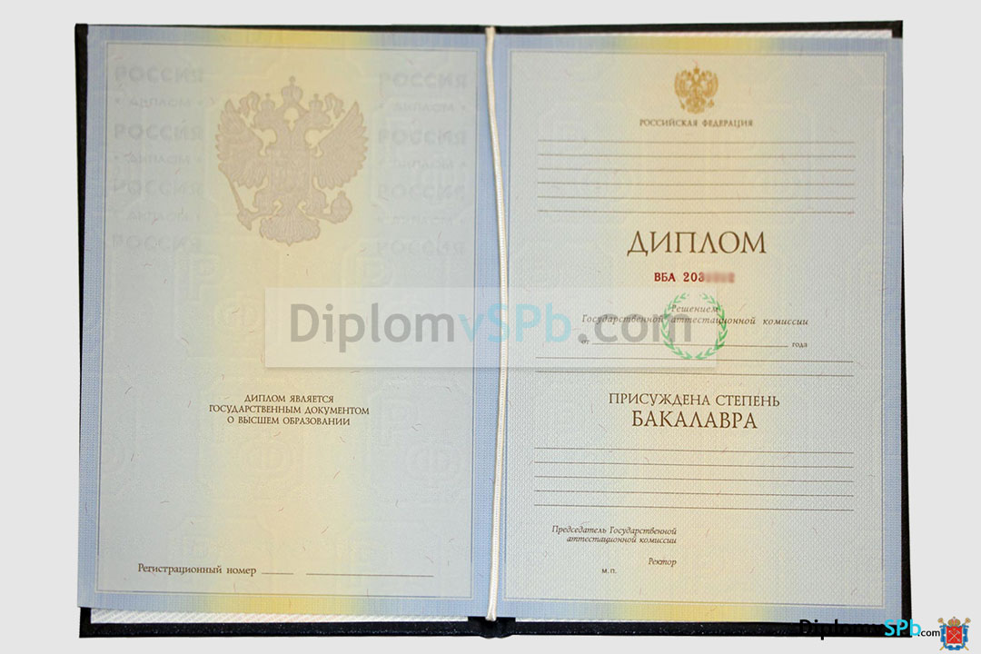 Диплом, выдаваемый в ВУЗах России отличается от предыдущих отсутствием венка в центре бланка, а также такой степени защиты, как слово «КОПИЯ», характерного для документов более ранних образцов. Вы не увидите его при ксерокопировании. Нумерация содержит всего 1-2 буквы и 5 цифр. Типография — только «Гознак». Заполняется как в учебном заведении, заверяется нужными подписями и актуальной на период выдачи печатью учебного заведения.
